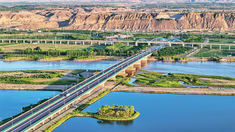 新時(shí)代生態(tài)文明建設(shè)的成就舉世矚目,成為新時(shí)代黨和國(guó)家事業(yè)取得歷史性成就、發(fā)生歷史性變革的顯著標(biāo)志。圖為2023年6月13日,位于寧夏中衛(wèi)的黃河公路大橋、黃河鐵路大橋與黃河濕地交相輝映,美麗如畫(huà)。人民圖片 柴更利/攝