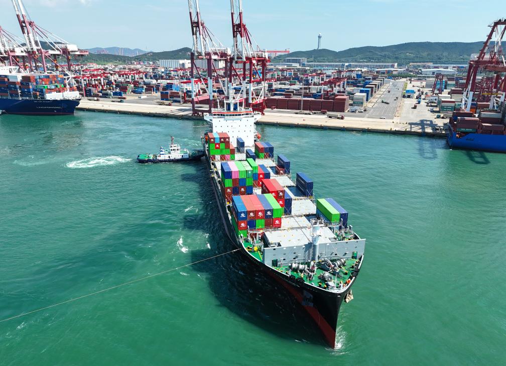 8月30日,“中外運(yùn)??凇陛喚従忨傠x山東港口青島港(無人機(jī)照片)。今年以來,山東港口青島港新增10條“一帶一路”航線,“一帶一路”國家和地區(qū)箱量保持兩位數(shù)增長。新華社發(fā)(張進(jìn)剛攝)