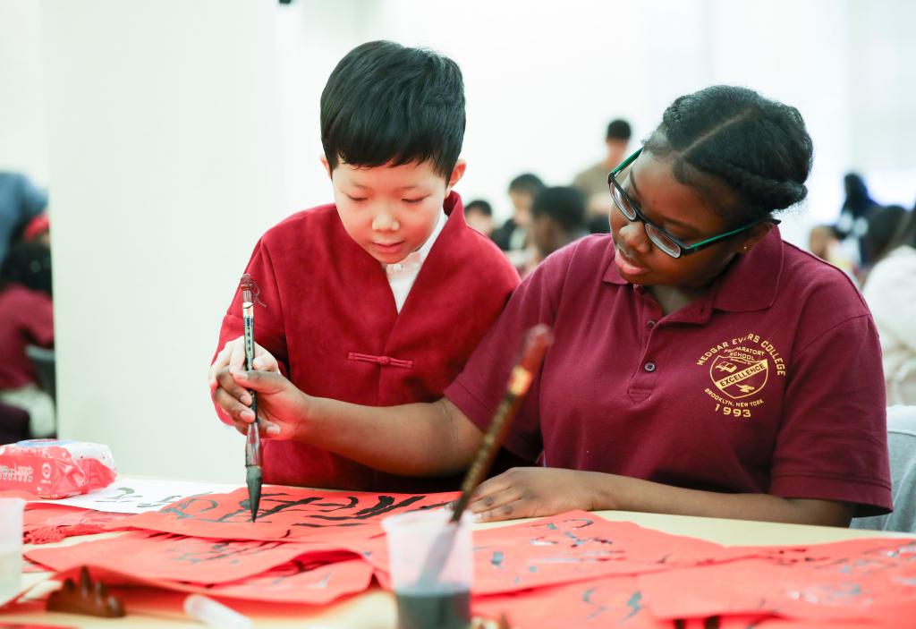 2018年2月2日,在美國(guó)紐約舉行的文化交流活動(dòng)上,來(lái)自北京的小學(xué)生教紐約梅德加·埃弗斯學(xué)院預(yù)備學(xué)校的學(xué)生練習(xí)中國(guó)書(shū)法。新華社記者王迎攝