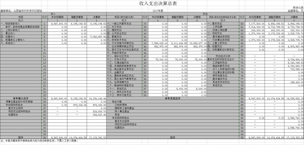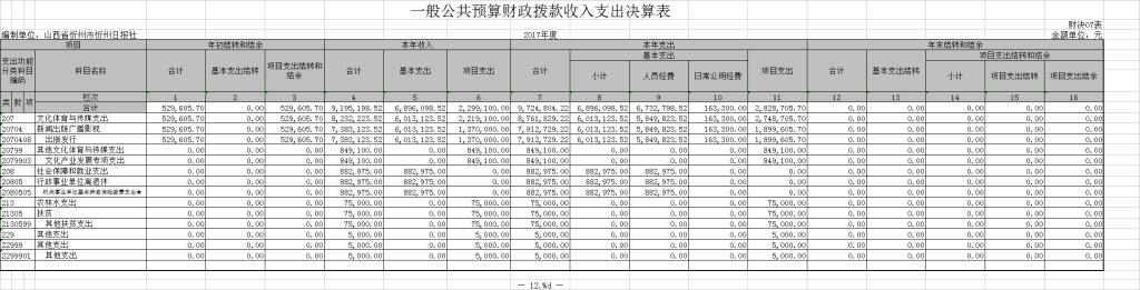 一、忻州日報社概況 (一)基本情況 忻州日報社是市委直屬的全額事業(yè)單位,正處級建制。忻州日報社全額事業(yè)單位編制73名。其中,領導職數5人,社長1名(正處),總編輯1名(正處),副社長1名(副處),副總編輯2名(副處),內設部室22個。我社主要負責忻州日報的出版發(fā)行及忻州在線等新媒體平臺的發(fā)布運營。 (二)主要職責 1、堅持政治家辦報的方針,把握正確的輿論導向,圍繞中心,服務大局,著力營造推進轉型跨越發(fā)展的輿論氛圍。 2、服從服務于市委、市政府中心工作,加強輿論宣傳和引導,發(fā)揮主流媒體作用,為開放造勢,為發(fā)展鼓勁,為人民盡責。 3、堅持從群眾中來,到群眾中去,圍繞“貼近實際、貼近群眾、貼近生活”,反映群眾的疾苦和呼聲,傾聽群眾的意見和建議,一切以為人民服務為出發(fā)點和落腳點。 4、堅持正面宣傳報道為主,積極開展輿論監(jiān)督。 5、承辦市委、市政府和市委宣傳部交辦的其他事項。 (三)部門決算單位構成 忻州日報社是一級預算單位,無下屬單位。部門決算只有一個單位,即忻州日報社。 (四)“三公經費”預算撥款開支情況 忻州日報社是全額事業(yè)單位,財政只撥付人員經費。我單位從財政撥款中沒有支出“三公經費”,“三公經費”數字為0,故有關“三公經費”的內容均為0。一般公共預算“三公”經費支出表、“三公”經費增減變化原因及因公出國、公務用車及公務接待等項均無數字。 (五)政府性基金決算情況 忻州日報社不涉及政府性基金,故政府性基金決算支出為0. 二、2017年度部門決算報表 1、收入支出決算總表