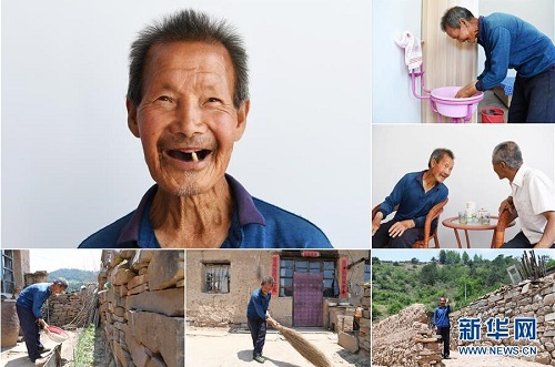 魏連保,男,1949年出生,山西省長治市沁源縣支角村人。獨居的他生活不便,2017年年底,村委會為魏連保在內的8位老人修建了一排整齊的新居,并統(tǒng)一安排就餐。 左上:魏連保肖像;右上:魏連保在新居洗臉;右中:魏連保(左)在新居和鄰居李秀成聊天;下右:魏連保在舊居前留影;下中:魏連保在舊居打掃院子;下左:魏連保在舊居為蔬菜澆水(拼版照片,6月18日攝)。 地處晉東南的山西省長治市,位于由太行山、太岳山環(huán)繞而成的上黨盆地中。在群山中、崖壁上,許多村莊自然條件惡劣,基礎設施落后,脫貧致富是大山深處人們的迫切心愿。 近年來,一場場脫貧攻堅戰(zhàn),在一個個深山村打響。政府全力探索脫貧路徑的同時,山區(qū)百姓因地制宜,靠自己的雙手和智慧走上致富路,交出了一份扎實的脫貧答卷。 記者在太行山、太岳山一路尋訪,記錄下多位70歲老人的生活。這些共和國的同齡人,親歷了山鄉(xiāng)的巨變,見證著長治山區(qū)脫貧攻堅偉大工程的一步步推進。 新華社記者 楊晨光 攝