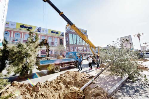 圖為園林工人在長征街挖運油松。智芝龍 趙曉煒 攝