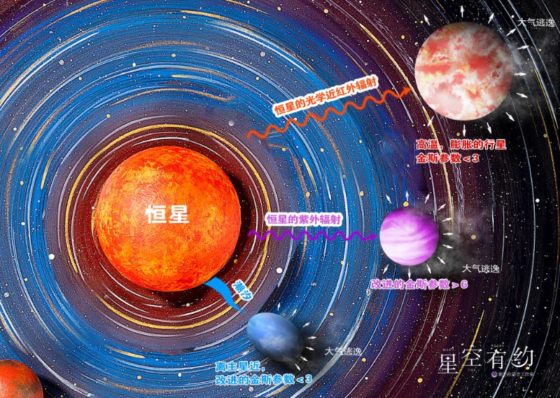 郭建恒說,在那些低質(zhì)量和大半徑的行星上,若行星有足夠的內(nèi)能或較高溫度,便可驅(qū)動大氣逃逸。研究發(fā)現(xiàn)使用經(jīng)典的金斯參數(shù),即行星內(nèi)能和勢能的比值,就可對上述逃逸是否發(fā)生做出判斷;對于內(nèi)能無法驅(qū)動大氣逃逸的行星,該研究通過引入恒星的潮汐力,定義了一個改進的金斯參數(shù)?!巴ㄟ^它,我們就能對恒星潮汐力和極端紫外輻射在驅(qū)動大氣逃逸上的角色進行區(qū)分?!?/p>