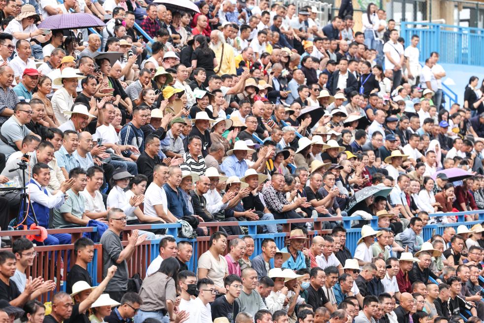 10月25日,全國和美鄉(xiāng)村籃球大賽(村BA)總決賽在貴州省臺江縣臺盤村開賽,觀眾在看臺上觀看比賽。新華社記者 歐東衢 攝