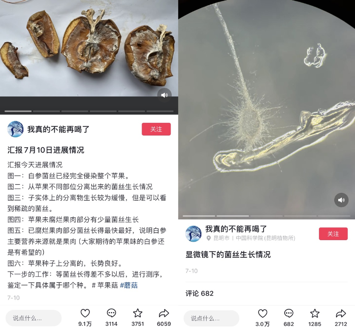 拿到樣本后,許博士對蘋果做了切片觀察,還在抖音上向網(wǎng)友實時更新起了菌絲生長情況,引發(fā)越來越多網(wǎng)友的“追更”。之后又有科普創(chuàng)作者@植物眼 專門采訪許博士的導(dǎo)師趙琪,他的細致講解讓很多網(wǎng)友紛紛表示“又學(xué)到了新知識”。