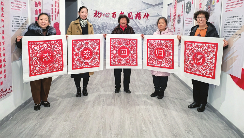 12月17日,陽(yáng)泉市城區(qū)下站街道,陽(yáng)泉市級(jí)非遺傳承人董淑芳(左二)與剪紙愛(ài)好者展示主題剪紙作品。當(dāng)日,下站街道舉辦“濃濃回歸情”主題剪紙活動(dòng),慶祝澳門回歸祖國(guó)25周年。所展示的剪紙作品圖案有的是澳門特別行政區(qū)區(qū)花蓮花,有的是象征團(tuán)結(jié)繁榮的牡丹花,還有象征福氣與好運(yùn)的福蝶和象征吉祥富貴的金魚(yú)。一幅幅精美的剪紙作品,表達(dá)了大家濃濃的愛(ài)國(guó)之情。 本報(bào)記者高樺攝影報(bào)道 (責(zé)任編輯:梁艷) |