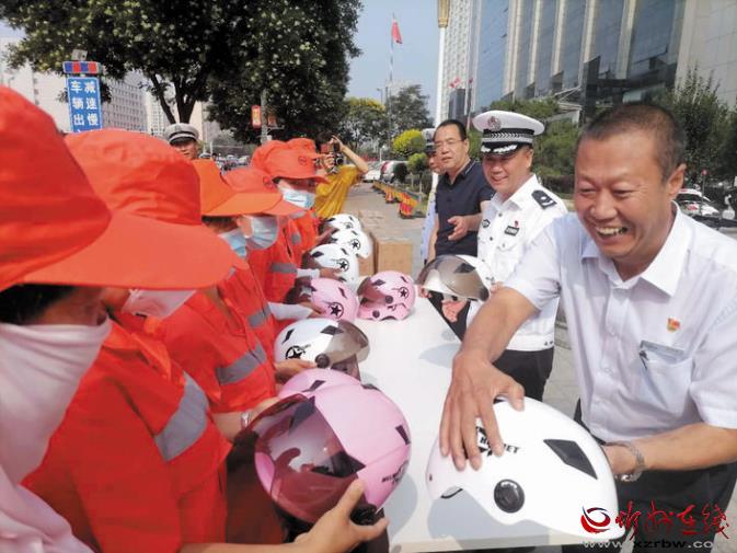 今年是我市創(chuàng)建全國文明城市的決戰(zhàn)決勝年,廣大環(huán)衛(wèi)工人一直默默奮斗在崗位上,為我市創(chuàng)文不斷努力。市公安局交警支隊始終牽掛著奮戰(zhàn)在基層一線的環(huán)衛(wèi)工人,支隊以此次贈送頭盔活動為契機,持續(xù)關(guān)心關(guān)愛環(huán)衛(wèi)工人的生命安全和身體健康。市公安局交警支隊負責人表示:“環(huán)衛(wèi)工人大多騎著電動三輪車或人力保潔車穿梭在大街小巷,機動車道是他們的主要作業(yè)區(qū)之一,佩戴安全頭盔,可以大大增加他們的安全系數(shù)。同時,環(huán)衛(wèi)等重點行業(yè)的示范引領(lǐng)作用,將有力帶動市民遵紀守法、安全出行,為文明城市創(chuàng)建打造一道亮麗的風景線。”圖為捐贈活動現(xiàn)場。張志遠 攝影報道