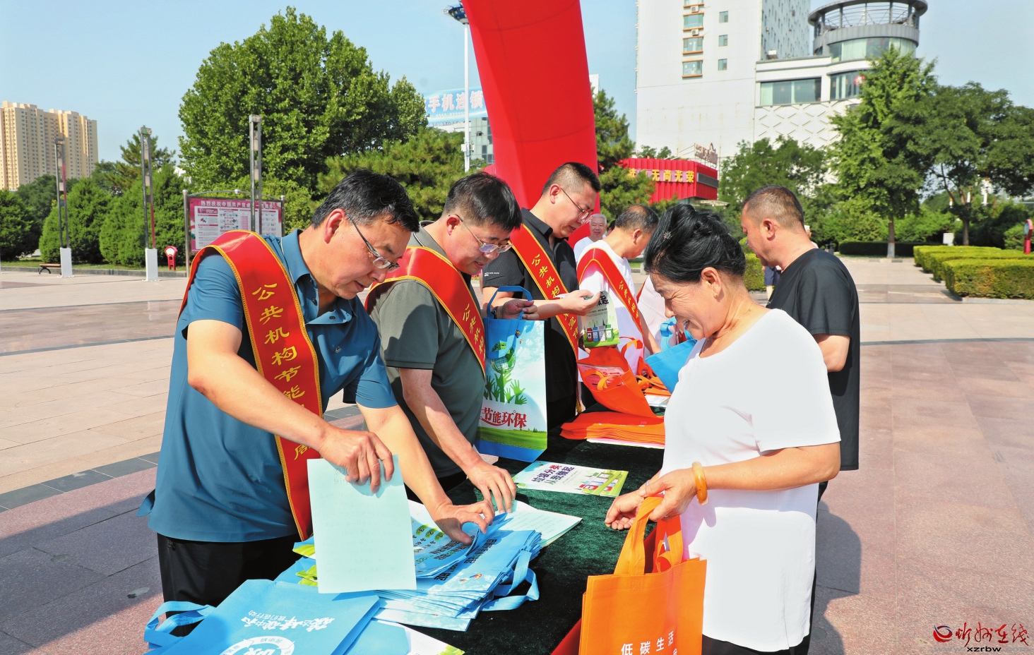 近日,原平市直屬機(jī)關(guān)事務(wù)服務(wù)中心在街心廣場(chǎng)開展以“節(jié)能降碳,你我同行”“積極應(yīng)對(duì)氣候變化,推動(dòng)綠色低碳發(fā)展”為主題的節(jié)能宣傳周活動(dòng)?,F(xiàn)場(chǎng)工作人員向市民宣傳《反食品浪費(fèi)法》,普及碳達(dá)峰碳中和、垃圾分類等知識(shí),鼓勵(lì)市民積極參與到節(jié)能減排的行動(dòng)中,倡導(dǎo)綠色低碳生產(chǎn)生活方式。圖為工作人員在街心廣場(chǎng)向過往市民發(fā)放宣傳資料,解答市民咨詢。 (褚震 攝)