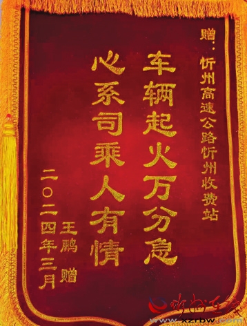 “嘀嘀,嘀嘀……”3月26日上午,一輛小型越野車行駛到忻州高速收費(fèi)站出口時突然起火,滾滾黑煙迅速彌漫開來,情況十分危急。面對突如其來的險情,收費(fèi)員賈金花臨危不亂,迅速拿起滅火器沖向火源。由于處置及時,火勢得到控制并最終被撲滅,車輛險情成功排除。事后為了表達(dá)感謝之情,司機(jī)特意給忻州高速收費(fèi)站送去一面錦旗。