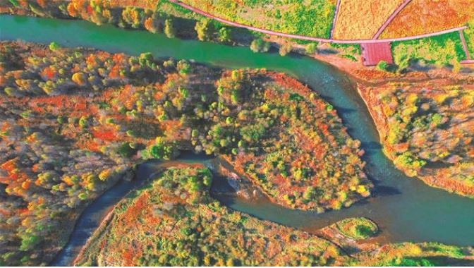 10月14日,航拍鏡頭下的靜樂(lè)汾河川國(guó)家濕地公園,秋意濃濃,景美如畫。 本報(bào)記者 張存良攝
