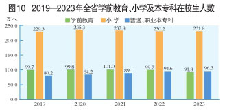 全年全省研究生教育招生2.1萬人,在學(xué)研究生6.1萬人,畢業(yè)生1.6萬人。普通本科招生14.7萬人,在校生55.1萬人,畢業(yè)生13.8萬人。職業(yè)本??普猩?3.8萬人,在校生41.2萬人,畢業(yè)生12.5萬人。中等職業(yè)教育招生13.8萬人,在校生41.6萬人,畢業(yè)生13.5萬人。普通高中招生21.2萬人,在校生67.8萬人,畢業(yè)生22.1萬人。初中招生37.1萬人,在校生112.2萬人,畢業(yè)生34.9萬人。小學(xué)招生39.9萬人,在校生231.8萬人,畢業(yè)生37.9萬人。特殊教育招生0.4萬人,在校生2.0萬人,畢業(yè)生0.4萬人。學(xué)前教育在園幼兒91.8萬人。(圖10)