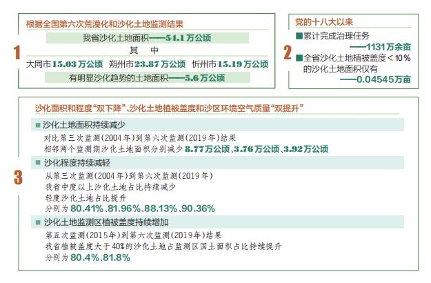 荒漠化是影響人類生存和發(fā)展的全球性重大生態(tài)問(wèn)題。我省晉西北和晉北地區(qū)是全國(guó)荒漠化監(jiān)測(cè)與防治的重點(diǎn)地區(qū)之一。經(jīng)過(guò)長(zhǎng)期積極探索,不斷創(chuàng)新機(jī)制和科學(xué)防沙治沙,我省實(shí)現(xiàn)了沙化面積和程度“雙下降”、沙化土地植被蓋度和沙區(qū)環(huán)境空氣質(zhì)量“雙提升”的實(shí)際成效。
