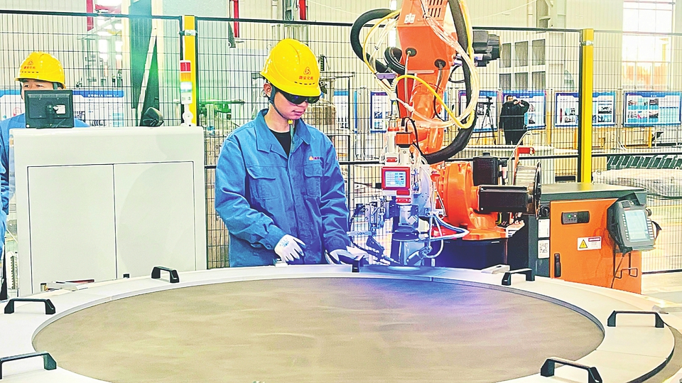 潞安化工機(jī)械(集團(tuán))有限公司新能源裝備分公司,工人正在操作一機(jī)雙工位鎳絲網(wǎng)激光焊接機(jī)。本報記者王蕾攝