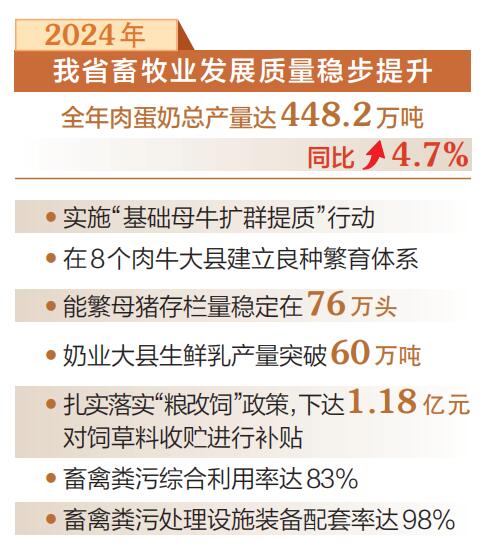2024年,我省努力克服畜產(chǎn)品市場(chǎng)價(jià)格下行等不利因素,有力紓解產(chǎn)業(yè)困難,有效破解被動(dòng)局面。扎實(shí)落實(shí)“糧改飼”政策,下達(dá)1.18億元對(duì)飼草料收貯進(jìn)行補(bǔ)貼。出臺(tái)生鮮乳購銷合同補(bǔ)貼、肉牛奶牛貸款貼息、奶企辦乳制品加工補(bǔ)貼等8條政策,全力幫助養(yǎng)殖場(chǎng)戶紓困,穩(wěn)定肉牛奶牛生產(chǎn)。同時(shí),優(yōu)化生豬產(chǎn)能調(diào)控機(jī)制,生豬養(yǎng)殖扭虧為盈。