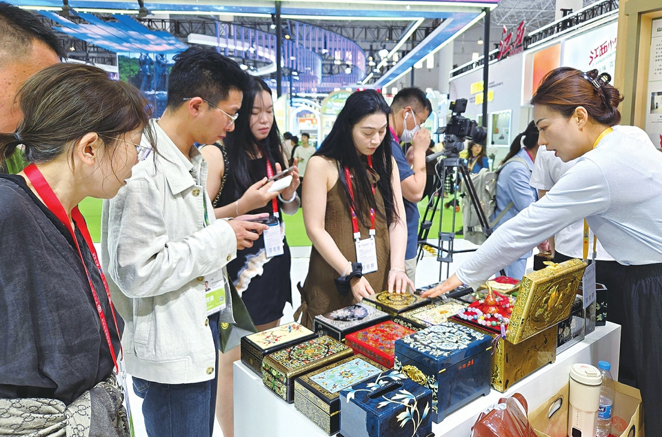 山西展區(qū)的平遙推光漆器吸引了眾多客商關注的目光。