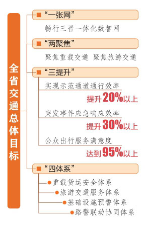其中,“一張網(wǎng)”指搭建一張暢行三晉一體化數(shù)智網(wǎng)。“兩聚焦”是重點聚焦重載交通、旅游交通。“三提升”是實現(xiàn)示范通道通行效率提升20%以上,突發(fā)事件應(yīng)急響應(yīng)效率提升30%以上,公眾出行服務(wù)滿意度達到95%以上。“四體系”則是形成重載貨運安全體系、旅游交通服務(wù)體系、基礎(chǔ)設(shè)施預(yù)警體系和路警聯(lián)動協(xié)同體系。