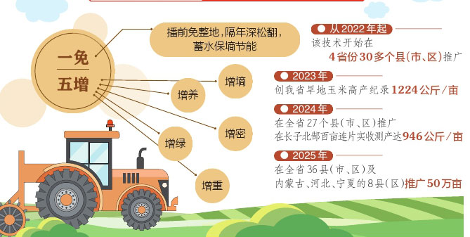 “一免五增”藝機(jī)一體化技術(shù)由山西農(nóng)大(省農(nóng)科院)有機(jī)旱作農(nóng)業(yè)研究院任志強(qiáng)科研團(tuán)隊(duì)實(shí)踐研發(fā)。其核心理念是通過農(nóng)藝農(nóng)機(jī)結(jié)合、良種良法配套,有效提高作物抗旱出苗、蓄水保墑和水肥利用率,秸稈自然腐熟,增強(qiáng)抗病性和抗倒性,從而通過增加密度助力單產(chǎn)提升,實(shí)現(xiàn)節(jié)本提質(zhì)增效和綠色可持續(xù)生產(chǎn)。該技術(shù)針對半干旱地區(qū)玉米生產(chǎn)中出苗難、秸稈還田成本高、機(jī)械作業(yè)成本高等問題,依托一體化農(nóng)機(jī)具實(shí)施保護(hù)性耕作,從而實(shí)現(xiàn)“一免五增”。“一免”即播前免整地,隔年深松翻,蓄水保墑節(jié)能?!拔逶觥奔础霸鰤劇?,溝播探墑,壟溝集雨,抗旱保苗;“增養(yǎng)”,秸稈歸壟腐熟,菌肥同播,培肥地力;“增密”,增株抗倒耐密,增加畝穗數(shù);“增綠”,測土分次施肥,增加穗粒數(shù),機(jī)械除草節(jié)肥藥;“增重”,一噴多促,延遲收獲增粒重。