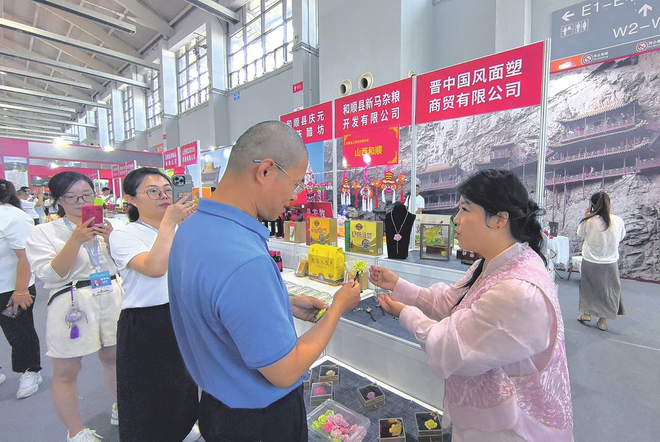 “中國(guó)雜糧之都”——忻州市組團(tuán)參展,帶來(lái)15種雜糧產(chǎn)品,更別出心裁地將雜糧融入文創(chuàng)領(lǐng)域。偏關(guān)老牛灣旅游產(chǎn)業(yè)開(kāi)發(fā)有限公司的展臺(tái)宛如一個(gè)調(diào)色盤(pán),玉米粒、帶殼小米、紅豆等被巧妙擺成多巴胺色系的山西景點(diǎn)山水畫(huà)。一位參展商說(shuō):“雜糧做的藝術(shù)品,盡顯山西智慧,讓雜糧文化煥發(fā)新生?!?/p>