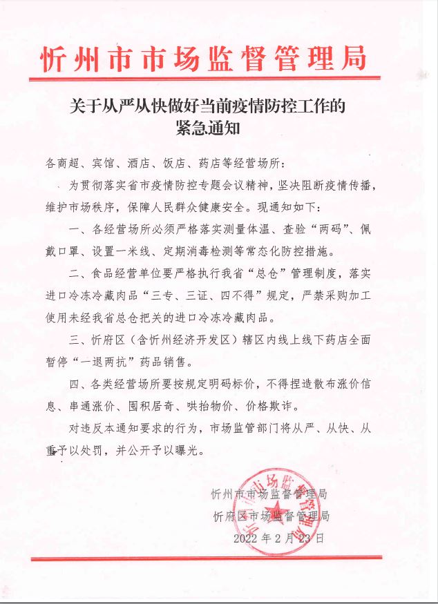 為貫徹落實省市疫情防控專題會議精神,堅決阻斷疫情傳播,維護市場秩序,保障人民群眾健康安全。現(xiàn)通知如下: