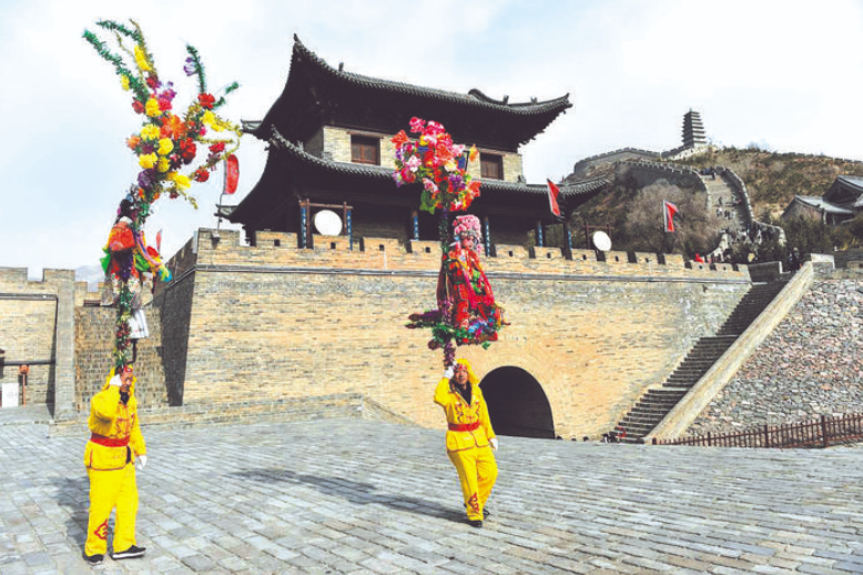 2月23日,在山西省代縣雁門(mén)關(guān),郝永俊(左)在進(jìn)行撓閣表演。
