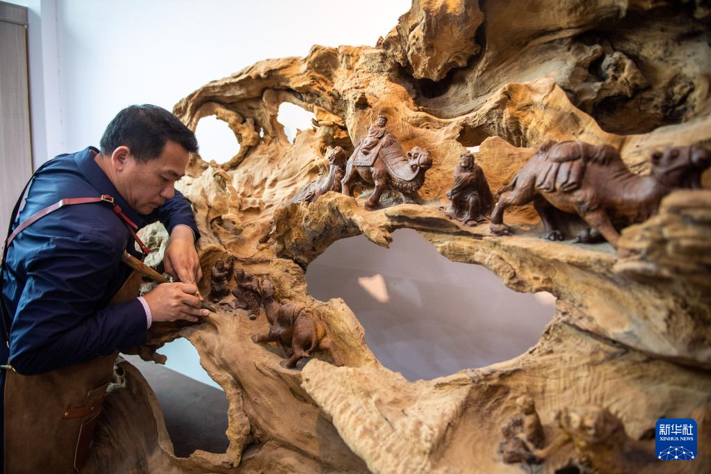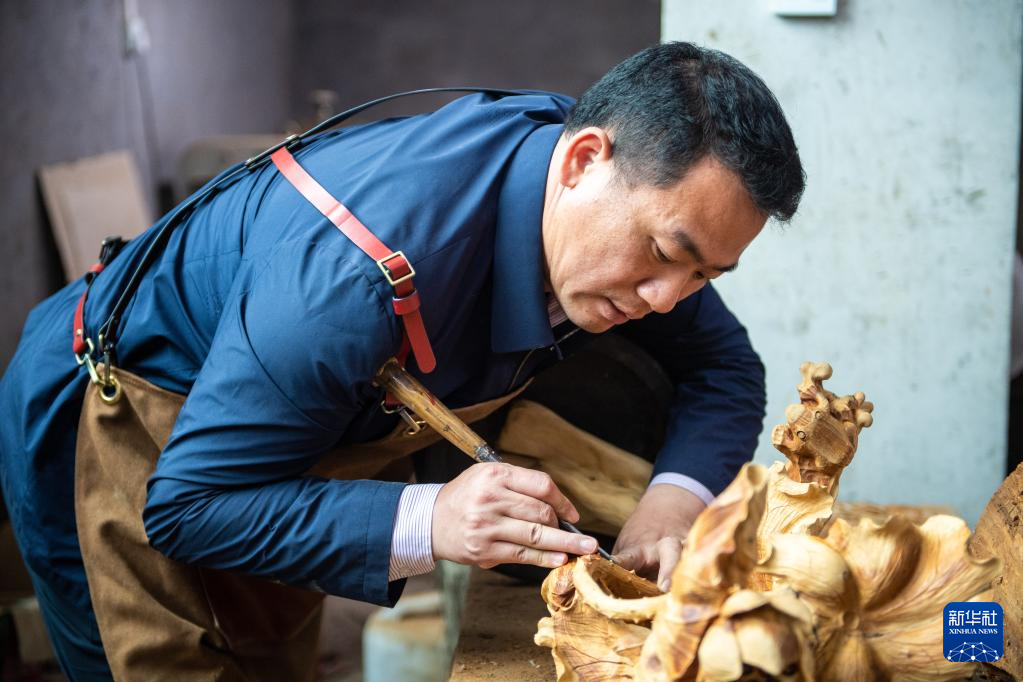5月23日,在洞口縣巖山鎮(zhèn)陽(yáng)家山村,洞口木雕非遺傳承人傅立先在創(chuàng)作木雕作品。