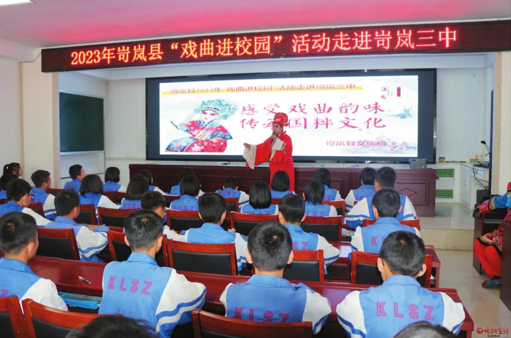 “樊梨花她好比鮮花一樣,練就了一套套飛龍花槍……”67歲的岢嵐縣晉劇團退休演員王潤花給岢嵐三中的同學們演繹晉劇《樊梨花》片斷,圓潤的唱腔加上演員的專業(yè)表演,引來臺下學生們的嘖嘖贊嘆;53歲的本土二人臺演員王藝文表演的《探親》選段,更是以生動、詼諧的表演和極富地方生活氣息的臺詞讓同學們投去欽佩的目光……當演員們表示要現(xiàn)場教大家“比劃”時,同學們爭相上臺跟著學起來。這是近日岢嵐縣2023年“戲曲進校園”活動走進岢嵐三中的場景。