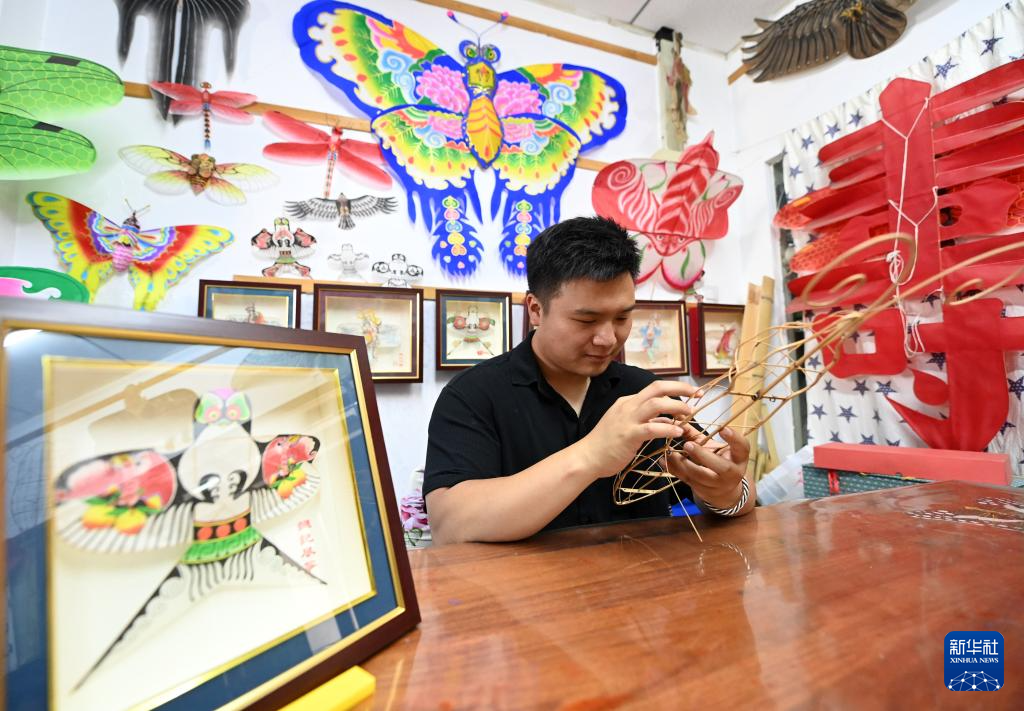 出身風(fēng)箏世家的魏博文大學(xué)畢業(yè)后,回到家鄉(xiāng)跟隨父親魏國秋“入行”做風(fēng)箏。他從自己有所基礎(chǔ)的繪畫著手,發(fā)揮年輕人的創(chuàng)新優(yōu)勢,在風(fēng)箏設(shè)計(jì)上屢屢出新,不僅與一些游戲公司合作推出風(fēng)箏聯(lián)名款,還推動風(fēng)箏制作技藝的改進(jìn)創(chuàng)新,設(shè)計(jì)了適合在室內(nèi)放飛的迷你風(fēng)箏。