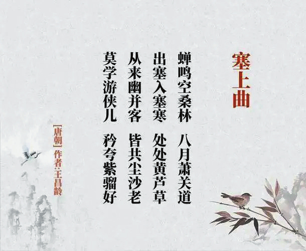 《塞上曲》唐(王昌齡):“蟬鳴空桑林,八月蕭關(guān)道。出塞入塞寒,處處黃蘆草。從來幽并客,皆共塵沙老。莫學(xué)游俠兒,矜夸紫騮好?!痹娭械娜稀⑷?,說穿了就是關(guān)外和關(guān)內(nèi)。但,其實景象沒什么特別,黃云、風(fēng)沙、駿馬、朔雪、美酒、桑林、關(guān)道、蘆草、沙場,也似乎只有這些才能更符合邊塞詩人的審美。而“雁門關(guān)”成了李頎、王昌齡這對好友的共同命題。