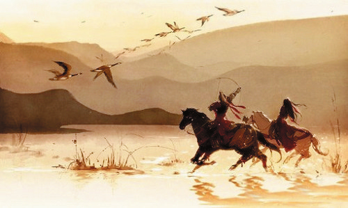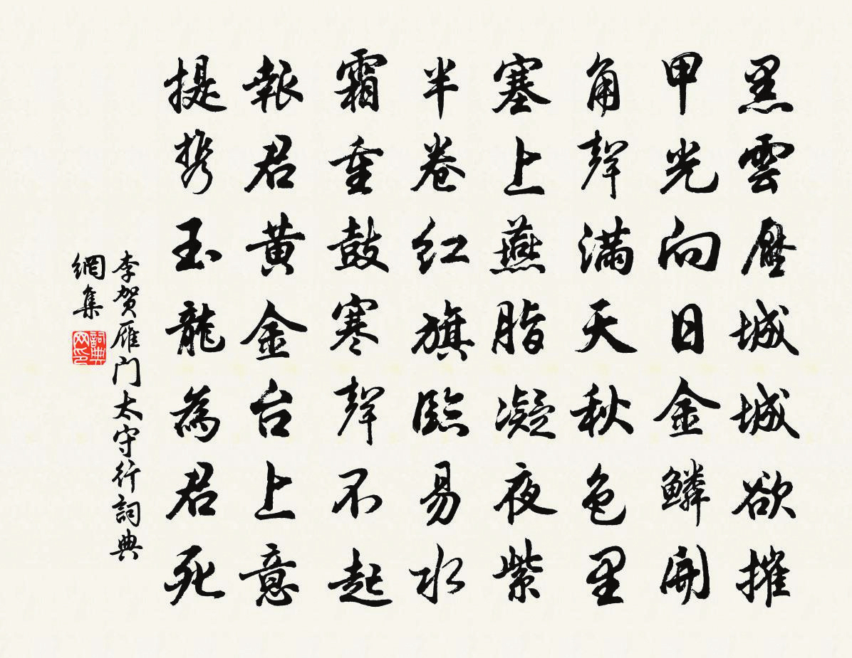 從詩仙手中接過筆的是“詩鬼”。李賀豪情萬丈,大筆一揮,筆走龍蛇,一幅巨作石破天驚,橫空出世。之所以說是一幅巨作,是因為李賀筆下的這首詩的確太像一幅畫了:“黑云壓城城欲摧,甲光向日金鱗開。角聲滿天秋色里,塞上燕脂凝夜紫。半卷紅旗臨易水,霜重鼓寒聲不起。報君黃金臺上意,提攜玉龍為君死?!?/p>
