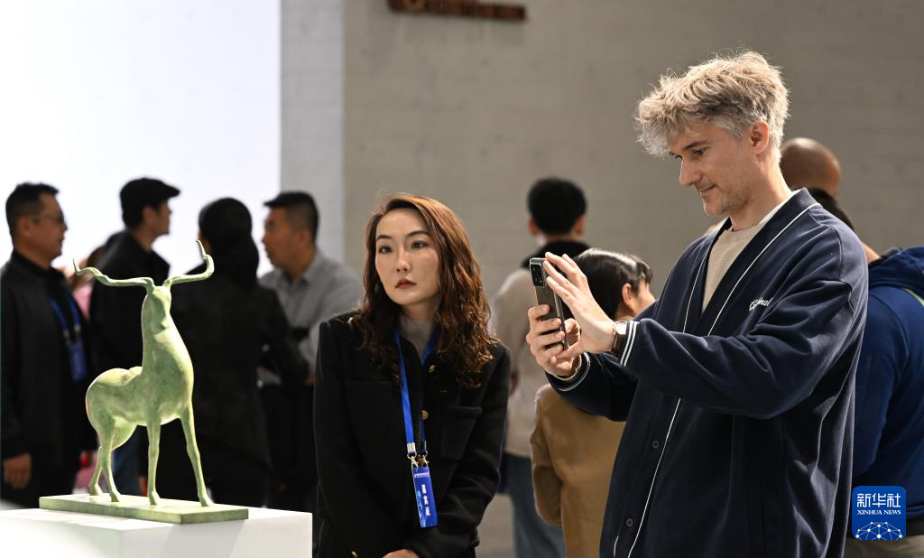 10月14日,觀眾在首屆呼和浩特國際雕塑藝術(shù)展上觀賞雕塑作品。