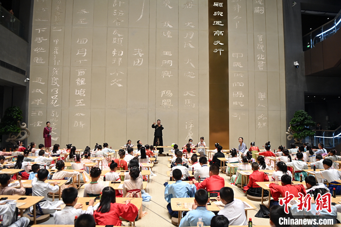 圖為9月7日,小朋友們在位于甘肅蘭州的甘肅簡牘博物館學習書寫簡牘中的文字。中新社記者 九美旦增 攝