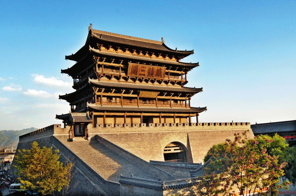 萬(wàn)里長(zhǎng)城第一樓——代縣古城邊靖樓。明洪武七年(1374年)始建,成化十二年(1476年)重建,由磚券洞臺(tái)基和三層四檐歇山頂樓身組成,基底東西長(zhǎng)43.3米,南北寬33.3米,臺(tái)高13.3米。樓身高26.7米,總高度達(dá)到40米。樓身面闊7間29.65米,進(jìn)深5間19.30米。二層檐柱之上施五踩重翹斗拱,三層檐下施五踩重昂。每層四周呈上下重疊柱網(wǎng)布局,四周圍廊,別具特色。斗拱非常規(guī)整,梁架精致奇巧,建造恢宏威嚴(yán),是中國(guó)最大的木質(zhì)鼓樓,比山海關(guān)靖邊樓高15米,比嘉峪關(guān)城樓高17米,比天安門高5.3米,被長(zhǎng)城專家考定為萬(wàn)里長(zhǎng)城第一樓。