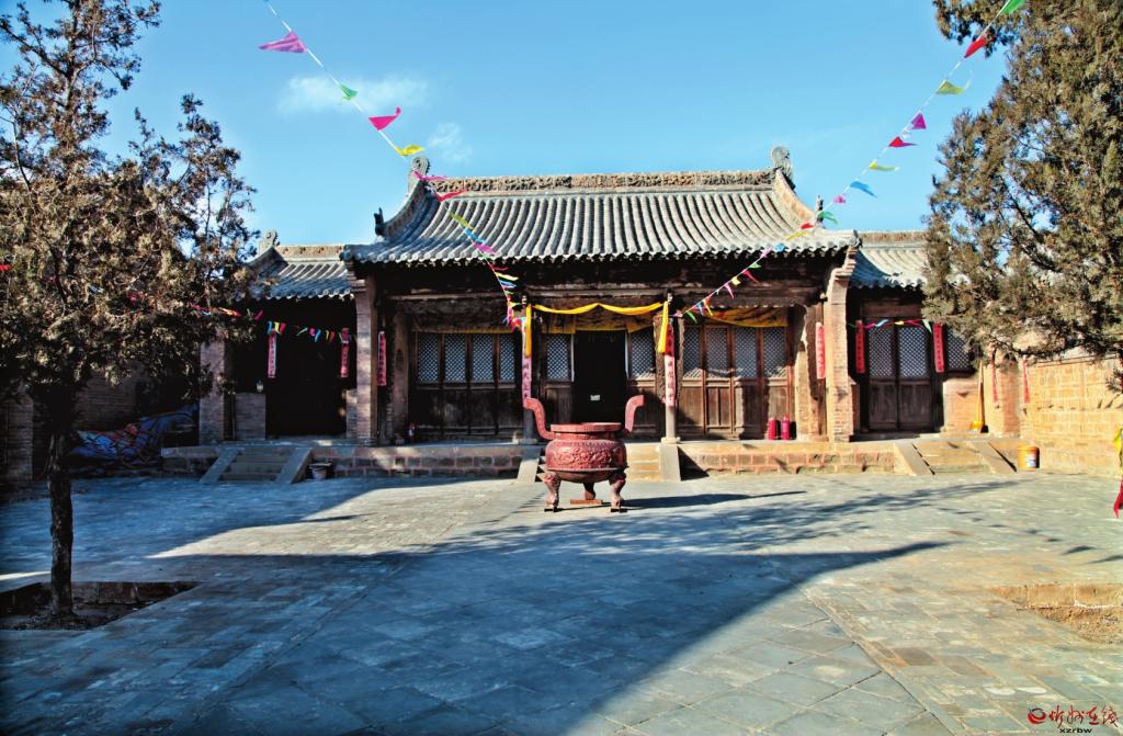 關(guān)帝廟:現(xiàn)存建筑有磚砌山門(mén)1座,面寬一間,硬山頂;左側(cè)鐘樓,基座石砌,中有窯洞,上部木構(gòu),硬山頂。正殿為關(guān)帝殿,面寬三間,進(jìn)深三椽,硬山頂,斗拱一斗二升交麻葉,耍頭云形,龍首,象鼻,三間均安格扇門(mén);殿內(nèi)合榻,木雕水波形,神龕內(nèi)供關(guān)云長(zhǎng);殿內(nèi)東西壁滿(mǎn)繪清代三國(guó)演義壁畫(huà)48幅,共計(jì)31平方米。正殿左右各有一間小屋,進(jìn)深二椽,硬山頂,格扇門(mén),格扇窗,為僧舍。院東小殿一間,硬山頂,斗拱一斗二升交麻葉。