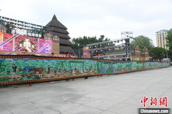 4月11日,2024年海南黎族苗族傳統(tǒng)節(jié)日“三月三”節(jié)慶活動(dòng)主會(huì)場(chǎng)開幕式暨文藝演出在保亭黎族苗族自治縣舉行。圖為黎族民俗風(fēng)情黎錦長(zhǎng)卷展示。張?jiān)潞?攝