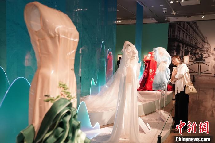 展覽現(xiàn)場。 史春陽攝 此次展覽分為蘇繡和時(shí)裝兩部分,為觀眾帶來一場跨界的時(shí)尚盛宴。蘇繡篇集中展示了設(shè)計(jì)師蘭玉作為蘇繡世家的第五代傳人,與其母——蘇繡傳人蘭堂花共同呈現(xiàn)的11件蘭氏蘇繡及蘇繡裝置作品;時(shí)裝篇展示了蘭玉近年來創(chuàng)作的22件現(xiàn)代服飾作品,這些作品以中國古代詩詞和繪畫作品為創(chuàng)作源泉,并融合了蘇繡傳統(tǒng)工藝與現(xiàn)代時(shí)尚設(shè)計(jì),體現(xiàn)了傳統(tǒng)與現(xiàn)代的結(jié)合。 記者在現(xiàn)場看到,設(shè)計(jì)師以中國古代詩詞歌賦為主題,創(chuàng)作出《疑是銀河落九天》《桃之夭夭灼灼其華》等時(shí)裝藝術(shù)作品,通過蘇繡、堆錦、絨花等非遺手工藝塑造的時(shí)裝藝術(shù),詮釋了“采菊東籬下,悠然見南山”的生活態(tài)度,“天生我才必有用,千金散盡還復(fù)來”的樂觀精神。在古老的詩歌與曼妙的紗羅之間展示了一個(gè)全新的美的時(shí)空,讓觀眾享受中國的文字之美、繪畫之美和絲綢之美。