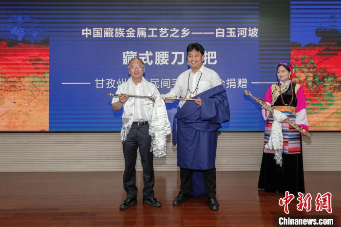 而甘孜州民族民間手工藝非遺協(xié)會會長、金屬鍛造傳承人日多向杭州工藝美術博物館捐贈了來自中國藏族金屬工藝之鄉(xiāng)——白玉河坡的兩把藏式腰刀。德格印經(jīng)院雕刻負責人、雕版印刷非遺傳承人江永扎巴則捐贈了兩件珍品:一件是大藏經(jīng)《甘珠爾》佛像全集版畫,共有58張,內容包括208個佛像和9個塔的圖像,共計217個圖像;另一件是《千手千眼觀音》唐卡印版圖畫,這是收藏在德格印經(jīng)院里面最早的佛像印版之一,距今四百多年。