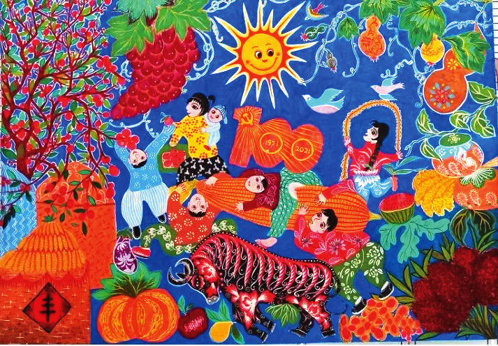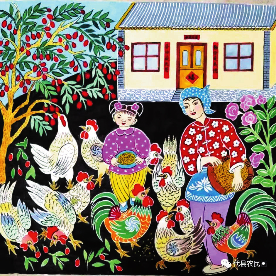 王粉玲《綠色家園》 她們的作品,取材于農(nóng)村、農(nóng)業(yè)、農(nóng)民生活,或表現(xiàn)美好的生活場景,或反映豐收的喜悅,或體現(xiàn)鄉(xiāng)愁,在表現(xiàn)手法上采用大膽的夸張、變形,巧用艷麗的色彩,人物刻畫細(xì)致入微,內(nèi)心喜悅躍然紙上,富有鮮明的地方特色。綜觀她們的作品,無不展現(xiàn)了社會主義新農(nóng)村在新時(shí)代的新變化、新風(fēng)貌,在傳承和弘揚(yáng)代縣文化、引領(lǐng)社會主義精神文明建設(shè)方面做出了出色的嘗試與實(shí)踐。