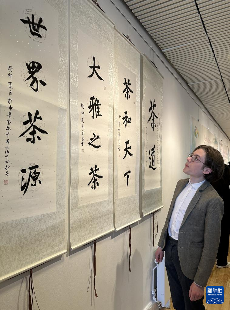 5月7日,在瑞典首都斯德哥爾摩的中國(guó)文化中心,參觀者觀看書(shū)法展示。