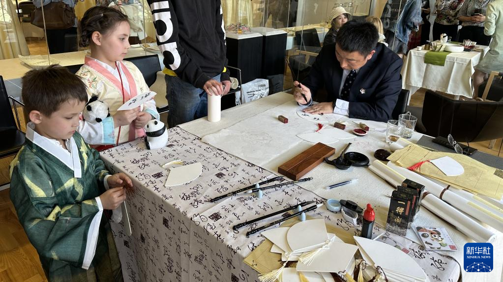 5月7日,在瑞典首都斯德哥爾摩的中國(guó)文化中心,瑞典兒童觀看中國(guó)書(shū)法展示。