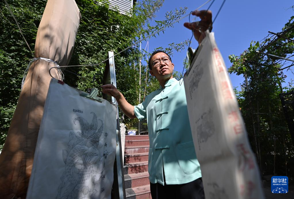 在天津市西青區(qū)的楊柳青霍氏古一張畫店,霍樹林把印好的“畫坯子”進行晾曬(6月6日攝)。