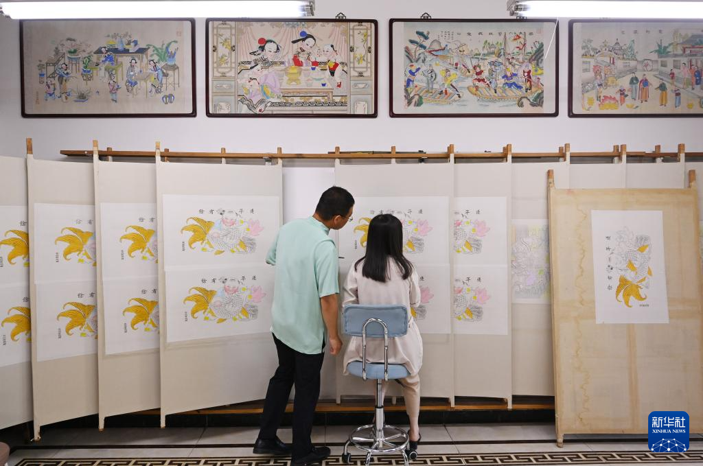 多年來,為了更好地保護傳承楊柳青木版年畫,霍樹林和父親將散落在各地的古版、畫稿搜集起來,籌建起一座年畫博物館,不同時期、風格各異的年畫古版有上百塊?;魳淞终f:“得讓年畫從墻上‘走下來’,吸引更多年輕人的目光。”如今,他和同為傳承人的妻子王丹一起將年畫元素與現(xiàn)代文創(chuàng)相結(jié)合,設(shè)計出的團扇、宮燈、撲克等產(chǎn)品,深受年輕消費者喜愛。新華社記者 李然 攝