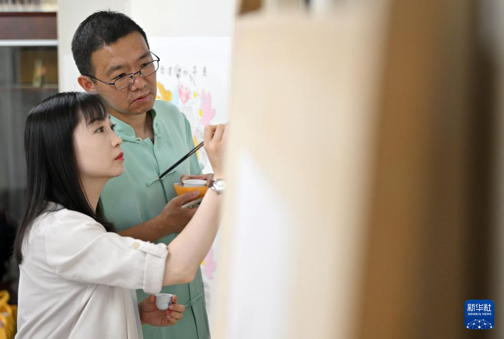在天津市西青區(qū)的楊柳青霍氏古一張畫店,霍樹林(左)和妻子王丹一起進行彩繪(6月6日攝)。