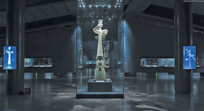 陳列展覽 三星堆博物館展出的青銅大立人,旁邊采用多媒體技術(shù)展示其服飾與造型解讀。宋豪新 張 艷攝影報道