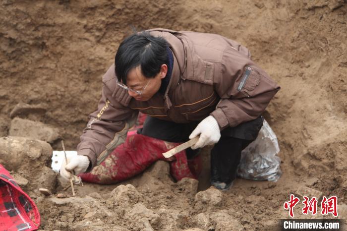 2012年1月16日,何利群在鄴城遺址東郭區(qū)佛教造像埋藏坑遺跡進(jìn)行現(xiàn)場(chǎng)發(fā)掘。 (鄴城考古隊(duì)供圖)