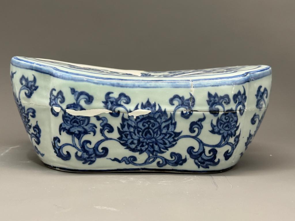 修復后的瓷枕器形一致,大小在長31.5厘米、寬23厘米、高12.3厘米左右。枕呈如意頭形,中空、枕面微凹、平底。枕面邊沿隨枕形勾勒雙線邊飾,其內(nèi)繪青花花卉紋飾,側(cè)壁亦繪青花花卉紋飾。外底中間銅錢紋,以作排氣用。