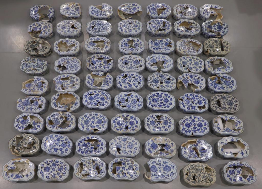 位于江西的景德鎮(zhèn)御窯博物館內(nèi)有一面“網(wǎng)紅墻”,展示了65件明代“空白期”青花瓷枕的修復件。這些瓷枕曾以碎片的形態(tài)深埋地下十余米數(shù)百年,又在文物修復師手中重獲新生,成為研究“空白期”官窯瓷器的重要實物依據(jù)。