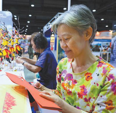 1月25日,在泰國國際旅游展上,參觀者體驗中國剪紙。本報記者 白元琪攝