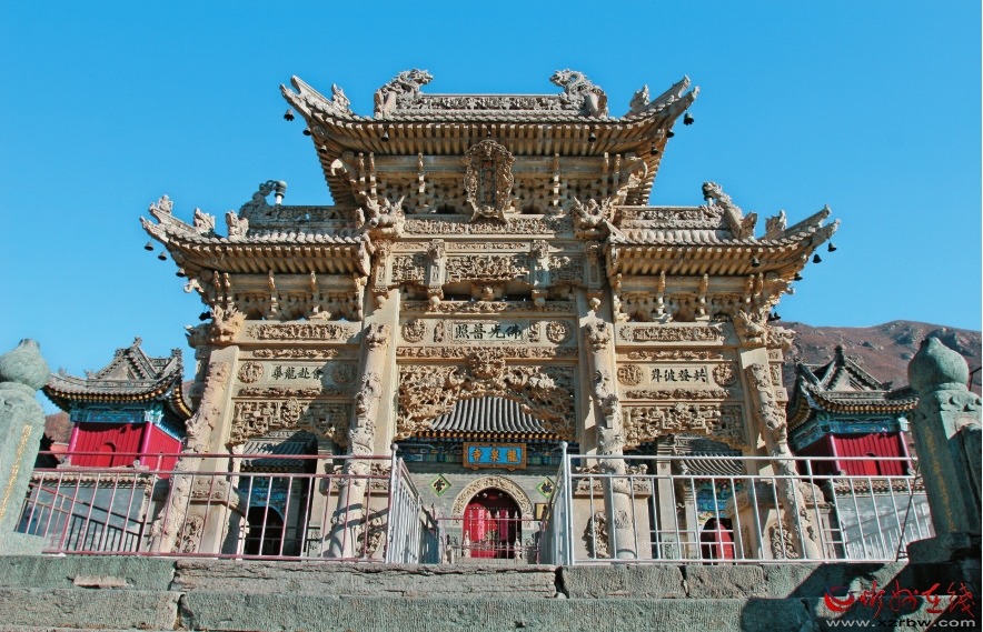 寺中的影壁、牌坊、墓塔是三件藝術(shù)瑰寶。影壁和牌坊與東院處在一條中軸線上,由108級(jí)石板臺(tái)階相連。臺(tái)階底部的照壁,正中所嵌一組漢白玉石雕,可以看作五臺(tái)山風(fēng)景名勝區(qū)主要寺廟的微縮示意圖。而臺(tái)階上面的三門四柱牌坊更為精致壯觀,全部用漢白玉雕造而成,前后垂檐和三門拱券采用鏤空雕法,玲瓏剔透,整個(gè)牌樓雕滿飛龍、花梁、紙扇、寶鏡、書(shū)筆、塵撣、玉壺等多種圖案,形象逼真。這座民國(guó)年間用10年時(shí)間雕成的牌坊是近代雕刻藝術(shù)的稀世之寶。牌坊后面的東大院前后兩進(jìn),有天王殿、觀音殿、大佛殿等建筑。