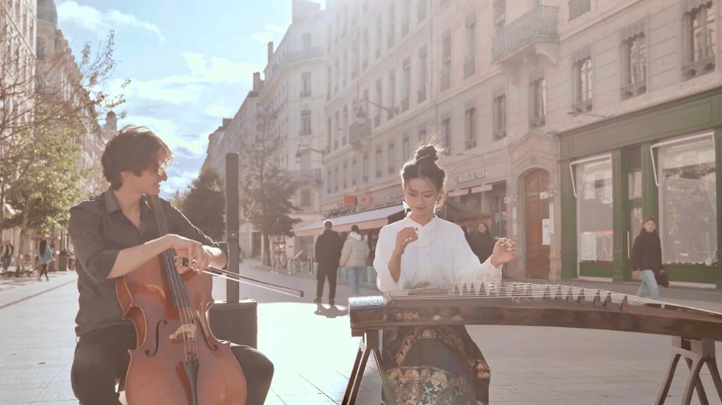 去年冬天,彭靜旋邀請(qǐng)法國(guó)大提琴家菲利克斯一起合作。一個(gè)是低頻濃厚的線狀樂器,一個(gè)是高頻清亮的點(diǎn)狀樂器,在陽(yáng)光明媚的下午,一首《浮光》在里昂街頭奏響。