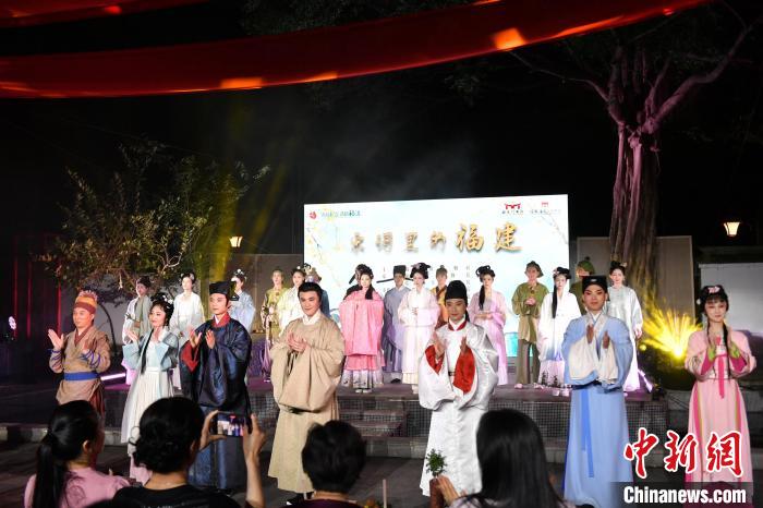 圖為參加“宋詞里的福建”沉浸式戲劇演出的演員出場(chǎng)謝幕。 中新網(wǎng)記者 呂明 攝